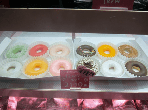 Any good finds there? Donut-shaped mochi! They look like colorful donuts, but are actually mochi filled with cream and drenched in a candy coating, then frozen. They taste similar to mochi ice cream – which is a ball of ice cream covered in mochi – but are filled with frozen cream, not ice cream.