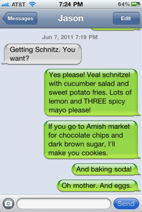 What do you order? A lot of schnitzel, which is a traditional Austrian dish of deep fried veal cutlets. And Thai takeout. I wish I could make pork chops, because I love them – but I know they’d just be raw in the center if I tried.