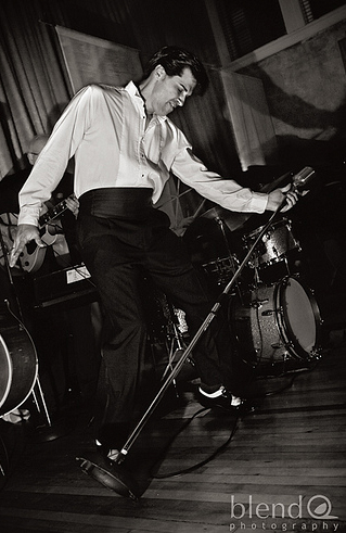 2. Find a niche in the market. All Elvis impersonators were doing the jumpsuit thing, so I opted to do young Elvis. Also, market your services as selling an experience. I sell the entire 1956 style, feel, energy, and vintage instruments– not just a guy who looks like Elvis.