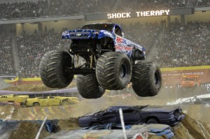 Do you mostly compete in races or do solo shows? There are two kinds of monster truck events. The first is side-by-side racing over cars. The second is 90 seconds of freestyle, when a truck is on the track by itself with tons of different obstacles, from airplanes to boats to mobile home trailers.