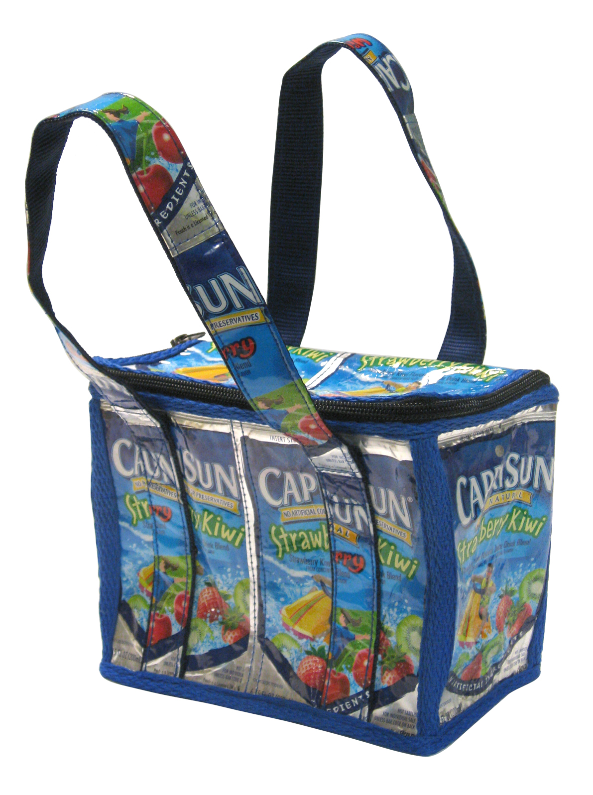 What’s the process of using chip bags and cookie wrappers to create new products? There are two ways. With upcycling, the wrappers maintain their branded look – you can still see the logo. We use heat presses to fuse the wrappers together, put on bolts, and cut and sew the material together like you’d do with regular fabric.