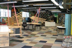 What does your office look like? It’s a shrine to garbage. The desks are made from old doors, the walls from soda bottles, the front showroom covered in recycled Astroturf with a mini putt-putt golf course. The desk dividers are made from vinyl records, and there’s graffiti on every wall – big, beautiful graffiti. The rugs are created from all different rug remnants, which can be a little nauseating.