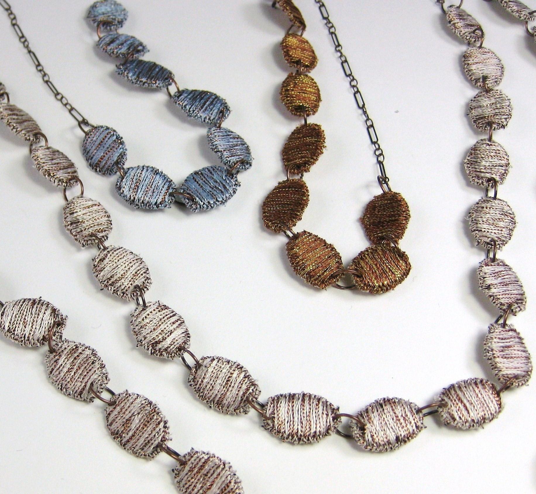 Your tricks of the trade: I always start out with taking a picture of my materials: the textile, chain, and tools I’ll be using. Then, I take a photo of the finished piece, as a point of reference. I also package all my jewelry in clear plastic “bubbles,” which I import straight from Italy.
