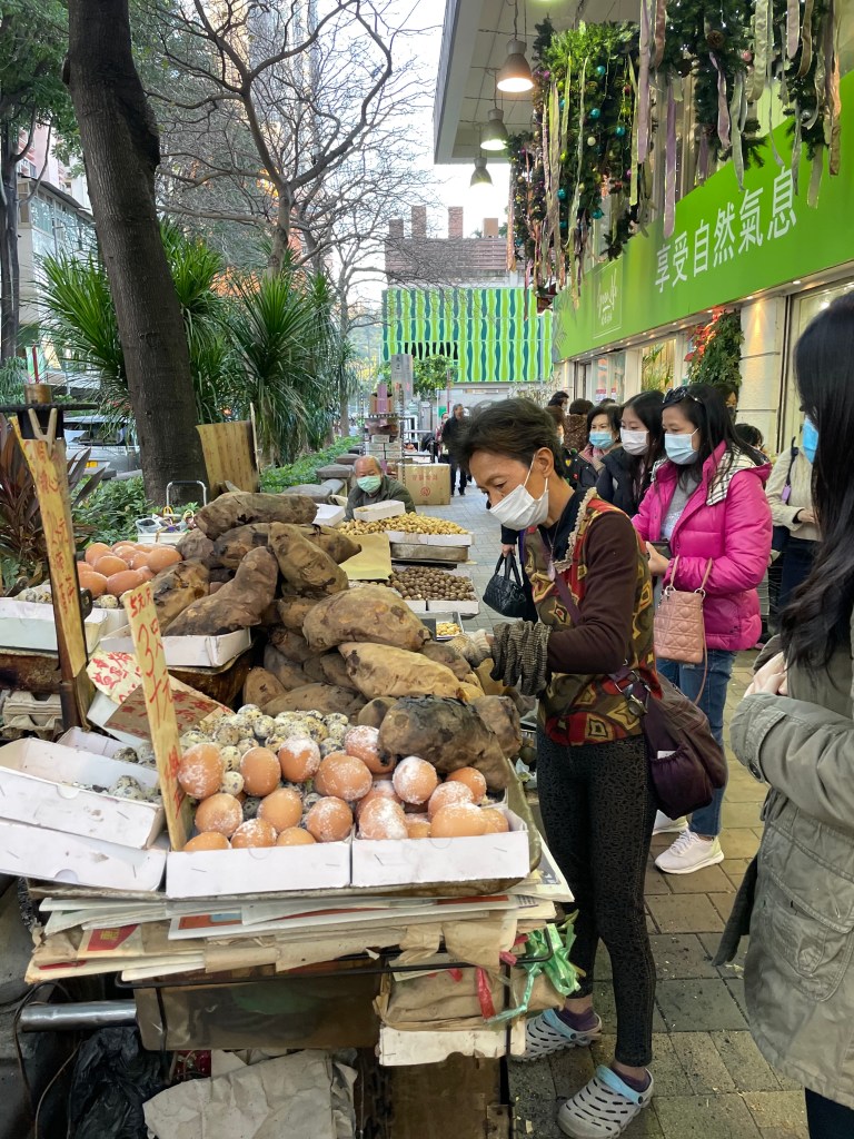 Meanwhile, throngs queue outside her cart on the coldest day Hong Kong has seen all year (48°F, or 9°C). They eye it all hungrily, doling out $20 HKD (about US$3) for a hand-sized brown paper bag filled with freshly roasted chestnuts — plus maybe one of those sweet potatoes, and maybe some of those macadamia nuts or quail eggs that Mrs. Chan also sells. Her retired husband sits on a stool just to the right of the cart, watching silently.