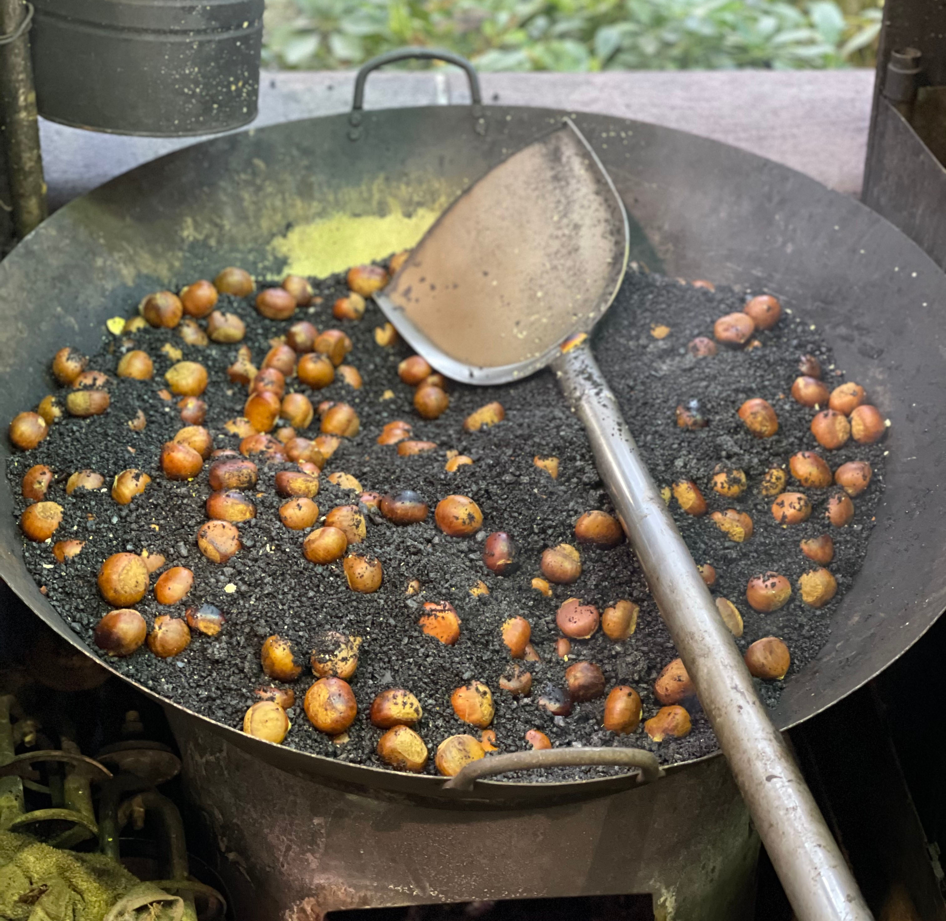 They crackle and sizzle like explosive popcorn on the giant wok burner, which is almost the size of Chan Yuk-Lan herself. The woman’s small frame hunches over her cart as she expertly swivels a metal spatula the length of her torso, propelling dozens of chestnuts through a cascade of sugar and sand that caramelizes their shells into a sheen.