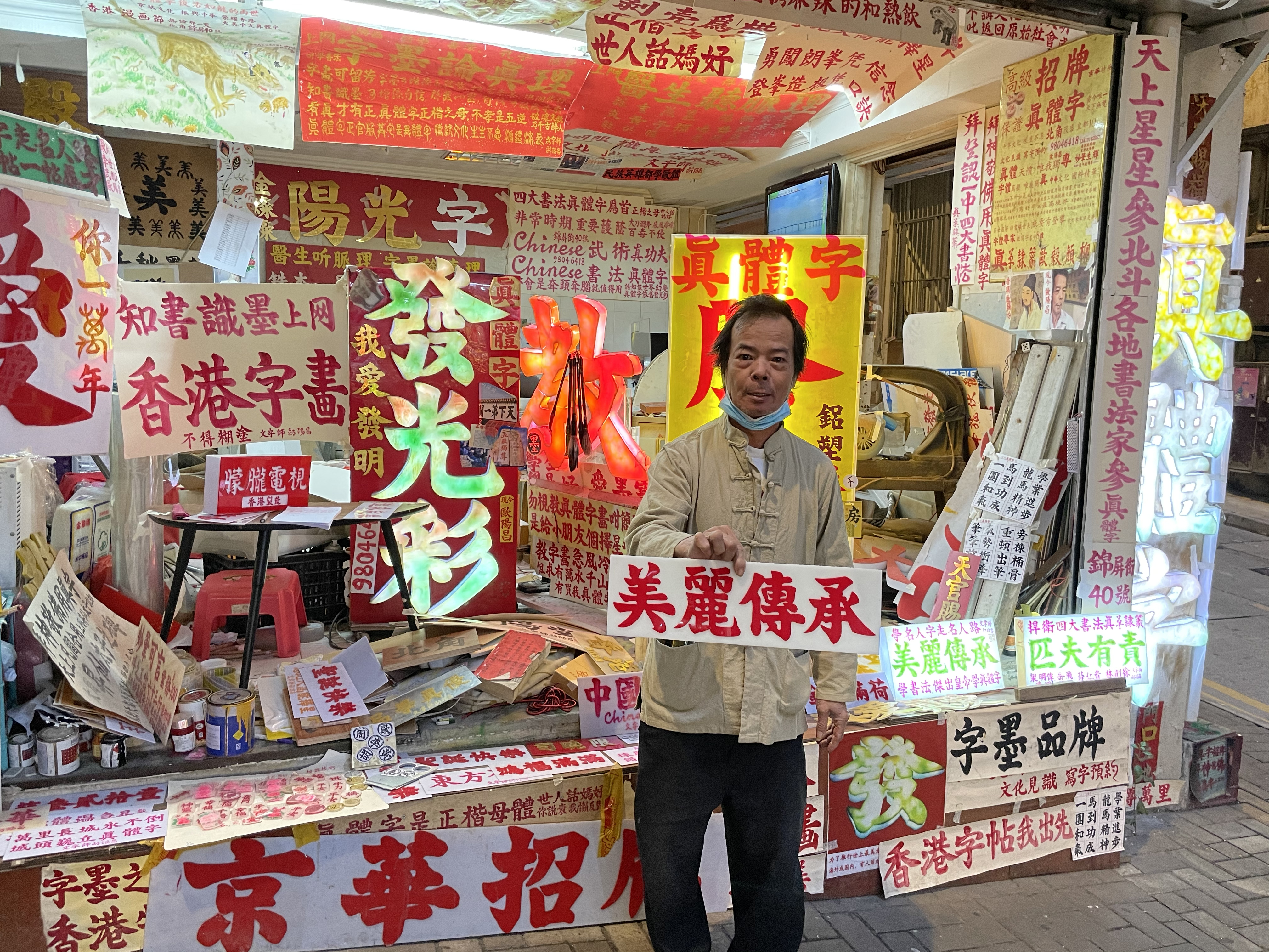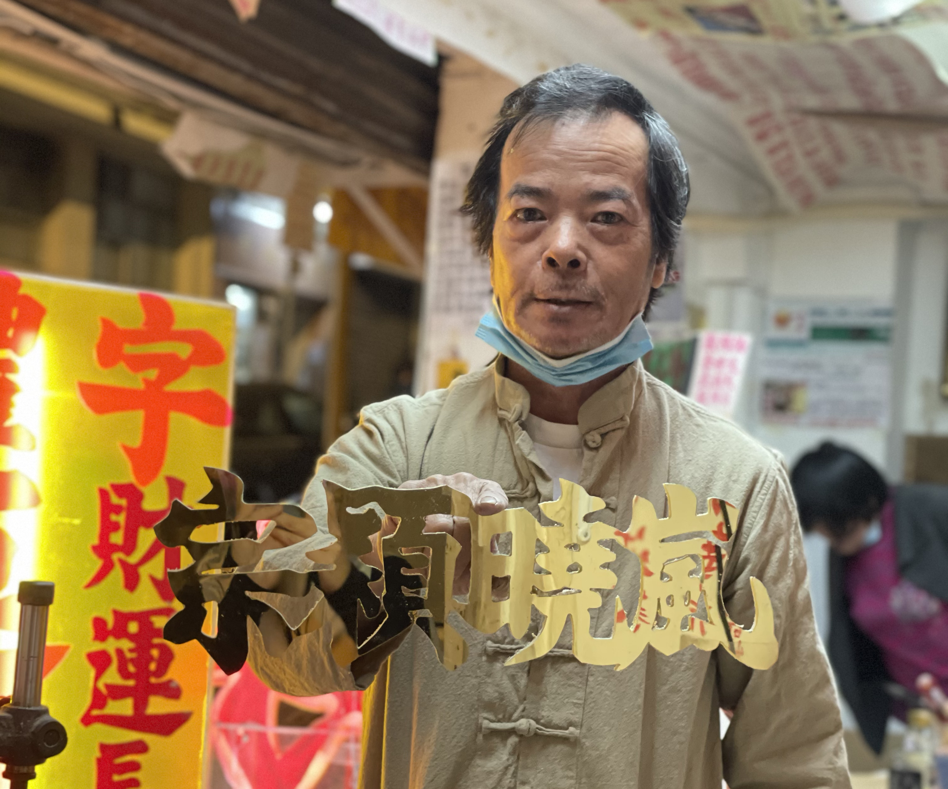 Au Yeung’s traditional handicraft can be found plastered across more than 1,000 buildings in Hong Kong if you just look up. He designs, builds and installs signboards across Hong Kong, everywhere from restaurants and jewelry shops to Chinese medicine clinics. The 65-year-old once even stood on the bamboo scaffolding outside a watch store to paint the company’s name onto a signboard.