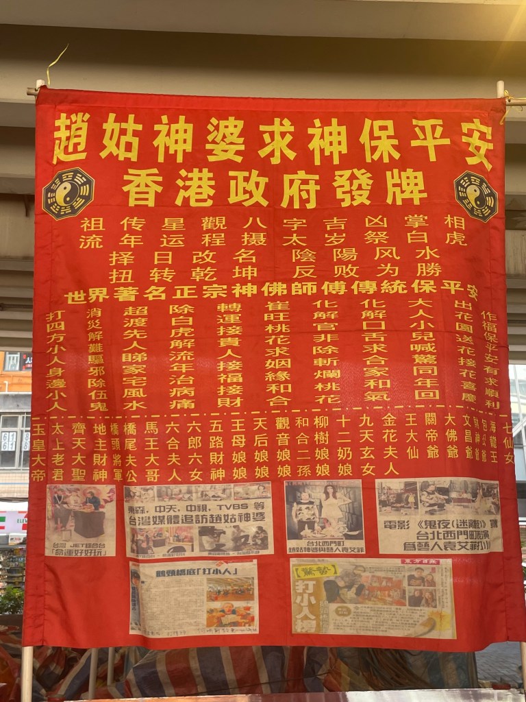 Chiu’s small space is filled with gods, fruits, incense sticks, a “licensed by the Hong Kong government” sign, and a long list of deities for clients to choose from. If it’s wealth you want, opt for the god of riches; if you seek revenge on your enemies, you might choose the monkey king. Chiu will then pray to the gods you’ve selected during the ritual.