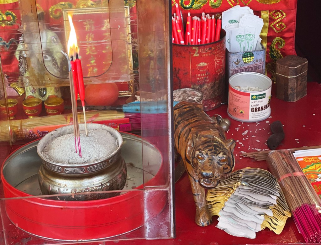 The next step is a sacrifice to the white tiger, a harbinger of bad luck, which is represented here by burning paper tigers. Finally, Chiu tosses a wooden divination tool to make sure the gods received her messages. The entire ordeal can take about five minutes.